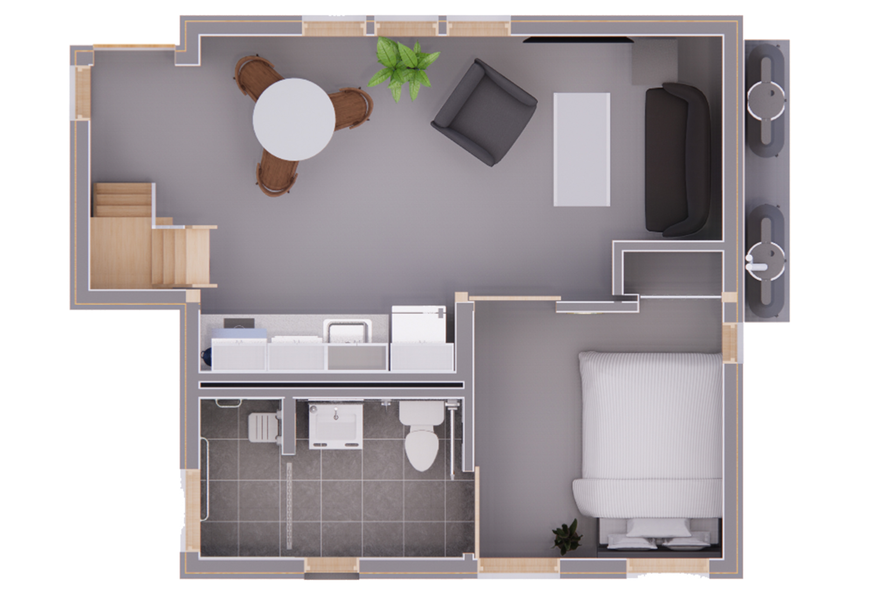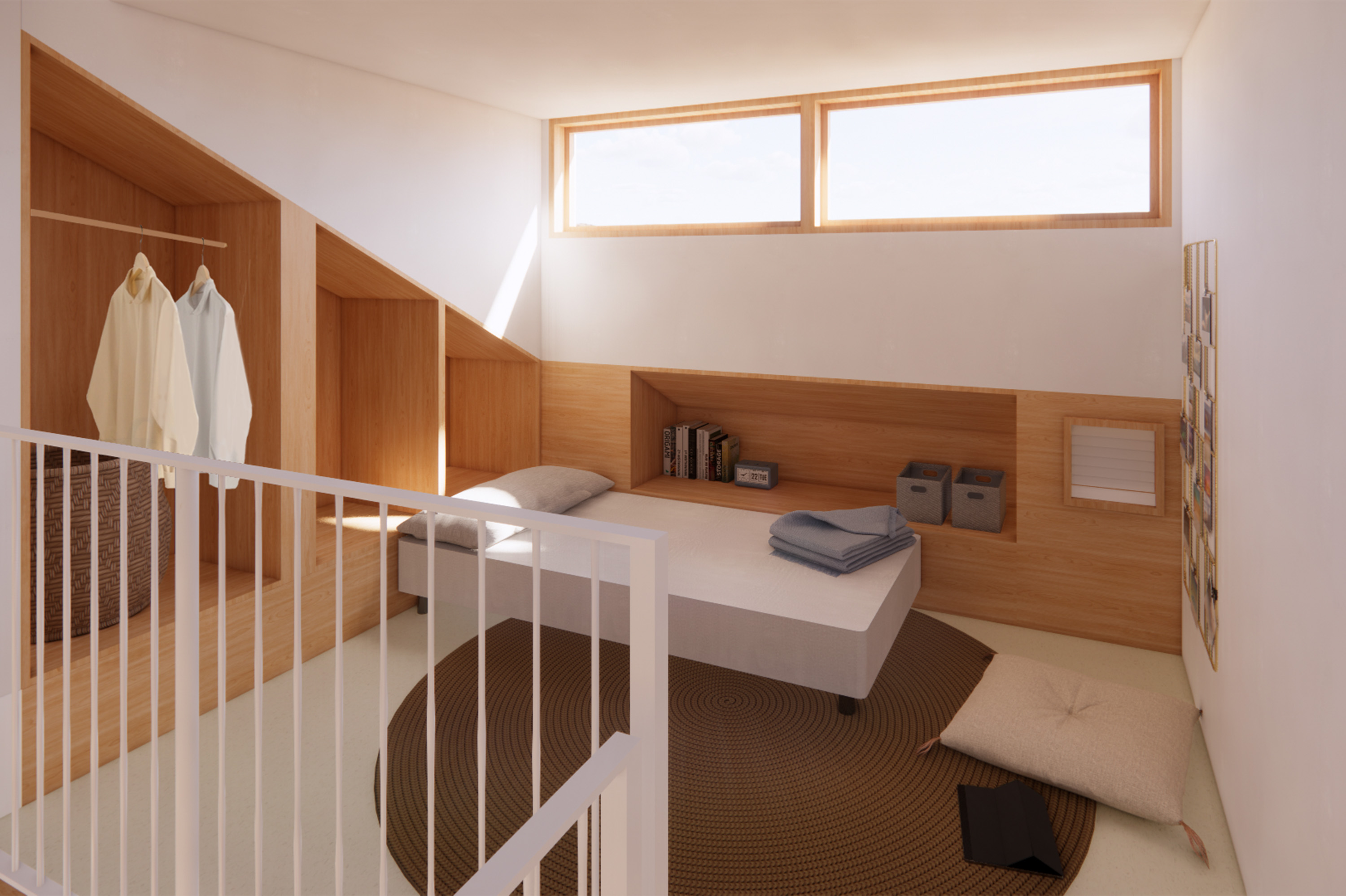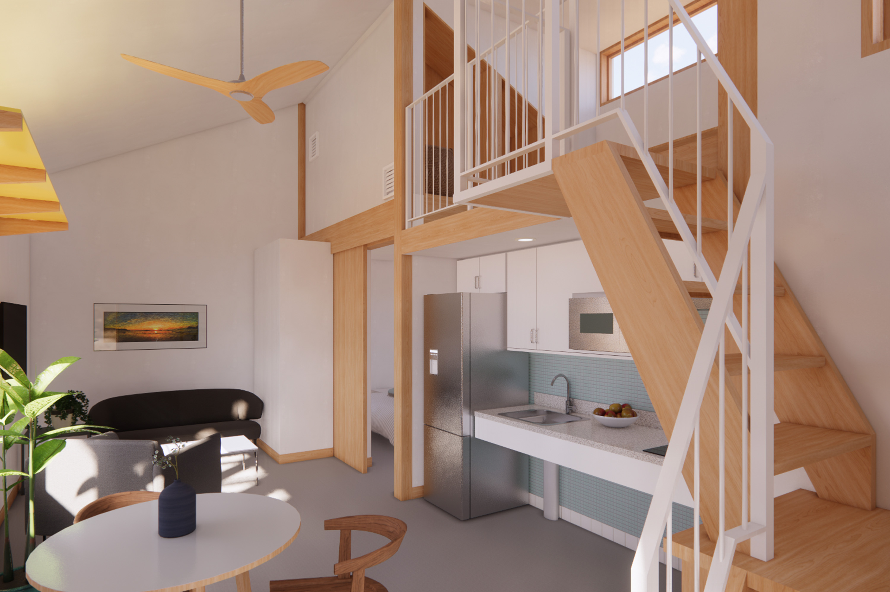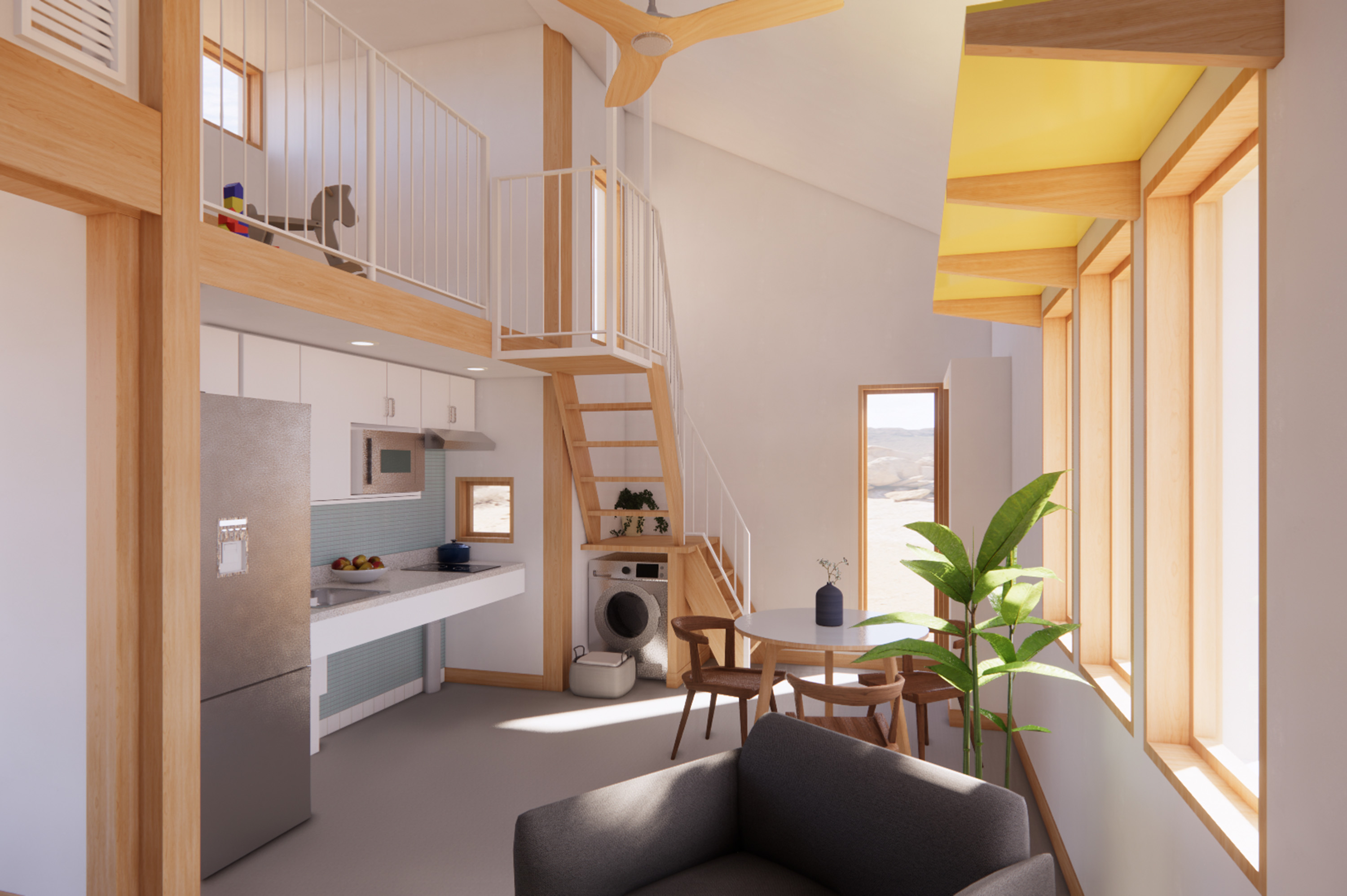 This 467-square-foot home features an open living area, full kitchen, bedroom, loft, and modern bathroom with a roll-in shower and built-in bench. Guided by universal design, the A⁺DU offers adjustable-height countertops, accessible sinks, and integrated smart-home features. Its compact footprint supports both aging in place and multi-generational living, fitting naturally into Los Angeles neighborhoods.